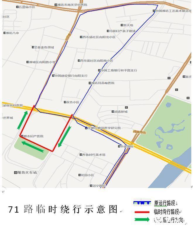 大众网记者 刘晓雨 通讯员 吴效山 郭严平 潍坊报道记者获悉,受健康街向阳路路口附近道路施工影响,为消除右转安全隐患,自2025年10月13日起,潍坊市公交集团对71路局部走向临时调整。具体调整方案如下:71路下行方向:车辆从柳西村发车,沿原线路运行至健康街和平路路口后,沿和平路-公交专用通道-向阳路北行恢复原线路运行,不再运行健康街(和平路-向阳路)路段。